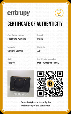 Prada medium Galleria in nero/ black Saffiano lux leather. Featuring gold-toned hardware, dual leather handles, a detachable leather strap, two external zippered pockets, leather with metal lettering logo at front, and snap closures on the sides. The top opens to a logo-print nylon lining interior with patch and zippered pockets. Approximate dimensions: 28.5cm(base-W) x 19cm(H) x 12.5cm(D), with a 12cm handle drop and 57cm adjustable strap drop. Accompanied by a leather clochette with keyring and Prada authenticity card. With Entrupy Certificate of Authenticity.