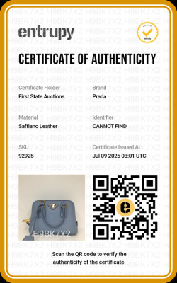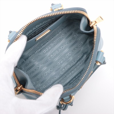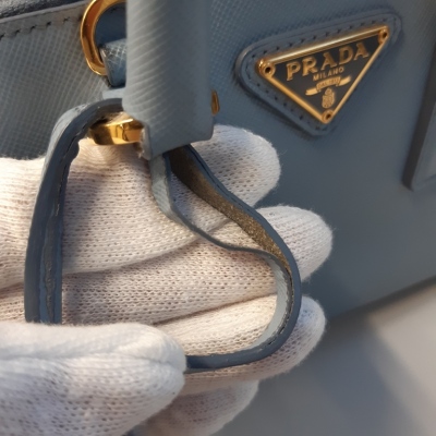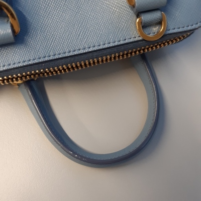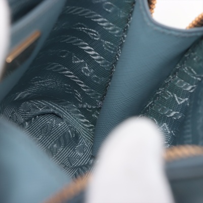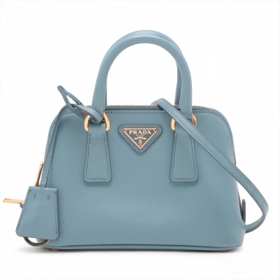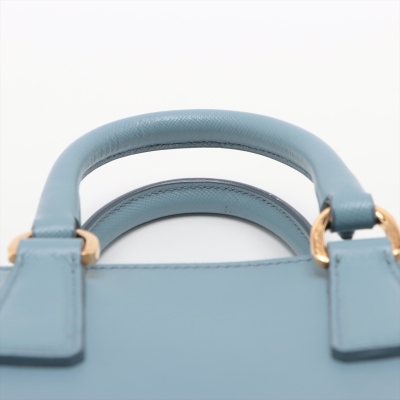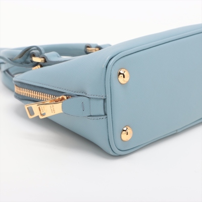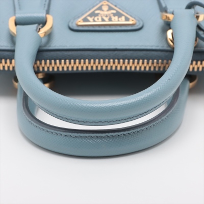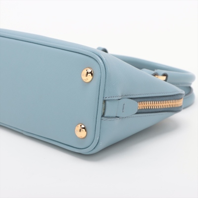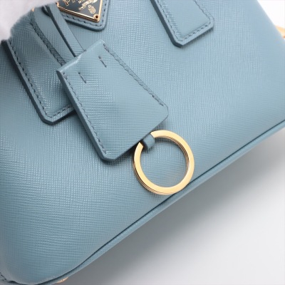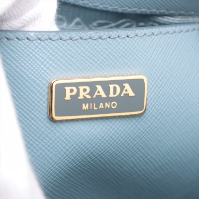 Prada mini Promenade shoulder bag in light blue Saffiano leather. Featuring gold-toned hardware, metal logo on leather triangle plate, and dual rolled handles. The dual zip closure opens to logo-printed nylon interior with a patch pocket. Approximate dimensions: 19cm(Base-L) x 12cm(H) x 8cm(D), handle drop 5.5cm, detachable and adjustable strap drop 66cm. Accompanied by Prada certificate card (dated 08/19). With Entrupy Certificate of Authenticity. (Pre-owned)
