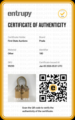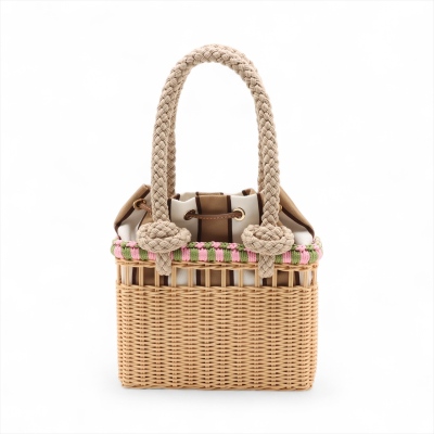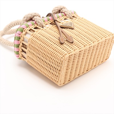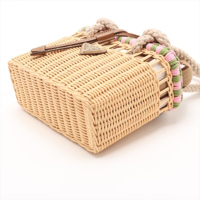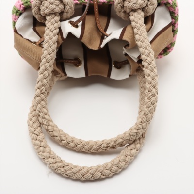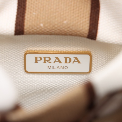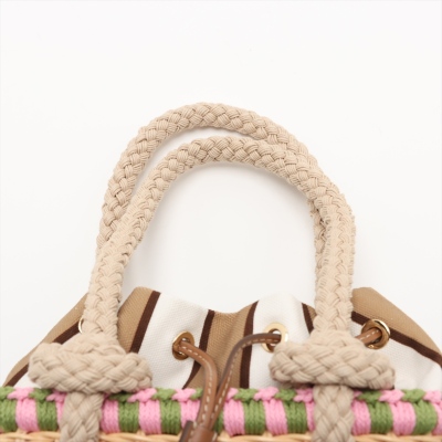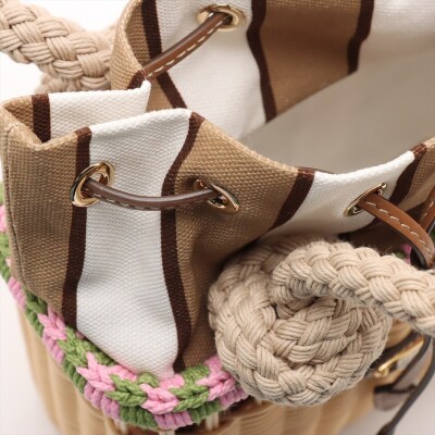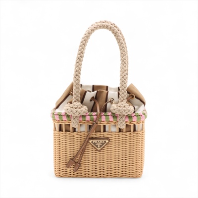 Prada mini tote bag in beige wicker and brown & white canvas. Featuring gold-toned hardware, triangle logo plate at front, dual braided rope top handles, a green and pink stitched trim, and brown & white striped canvas top. The leather drawstring closure opens to a white canvas-lined interior. Approximate dimensions: 18.5cm(L) x 20.5cm(H) x 7.5cm(D), and 13cm handle drop. Accompanied by a Prada dustbag and cards. With Entrupy Certificate of Authenticity. (Pre-owned)
