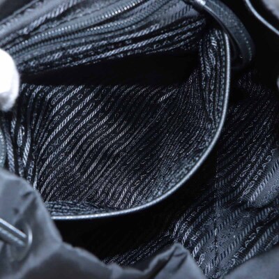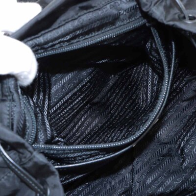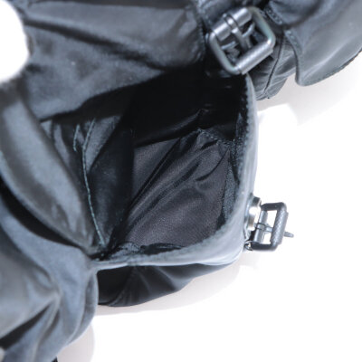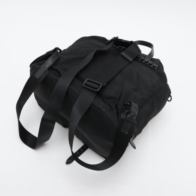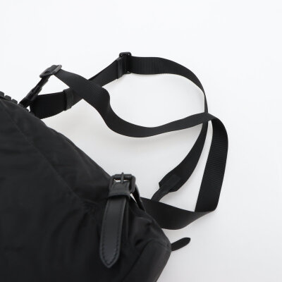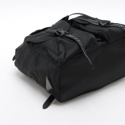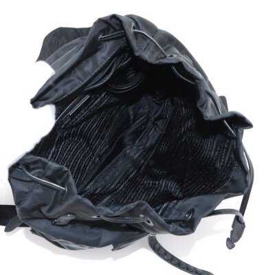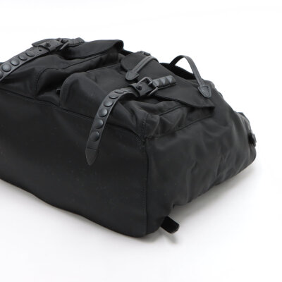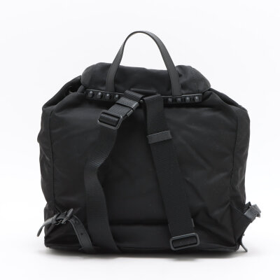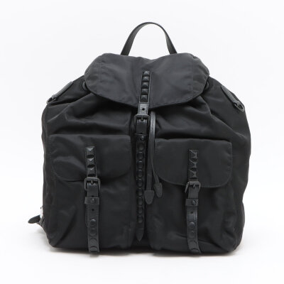 Prada New Vela Studded backpack in black Tessuto nylon and Saffiano leather details. Featuring matte black-toned hardware, twin front exterior pockets with buckle closures, leather with metal PRADA logo on the left side, and dual web shoulder straps. The magnetic flap closure and leather cinched cord opens to a black nylon logo-lined interior with zip and patch pockets. Approximate dimensions: 29cm(W) x 31cm(H) x 15cm(D), with a 9cm handle drop and 40cm adjustable strap drop. Accompanied by a Prada authenticity card (dated 09/07/18) and a dustbag. With Entrupy Certificate of Authenticity.