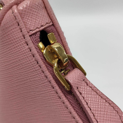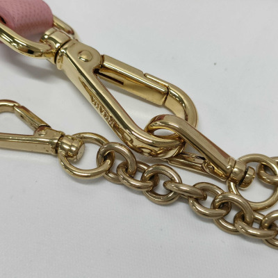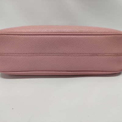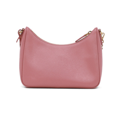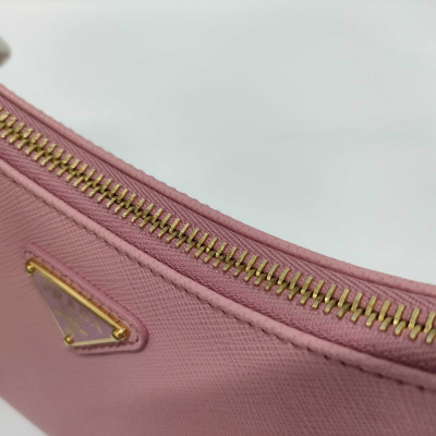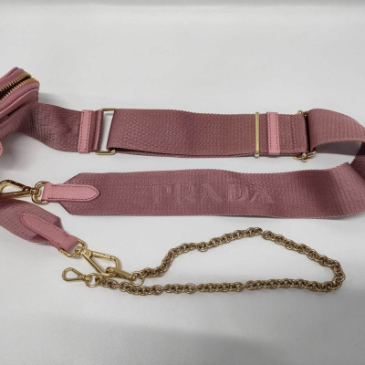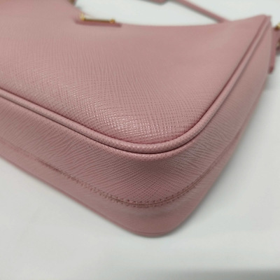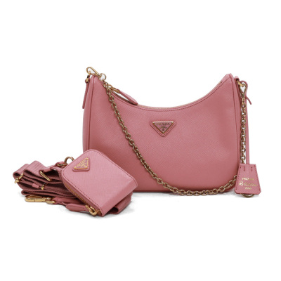Prada Re-Edition 2005 bag in pink Saffiano leather. Featuring gold-toned hardware, removable and adjustable logo-print woven tape shoulder strap, removable chain-link handle, and triangle logo plate at front. The top zipper closure opens to a pink logo-print nylon lining interior. Approximate dimensions: 22.5cm(L) x 17.5cm(H) x 6cm(D), with a 40cm adjustable strap drop and 24cm chain strap drop. Accompanied by a removable Saffiano leather zippered pouch and tag with a key ring. With Entrupy Certificate of Authenticity. (Pre-owned)