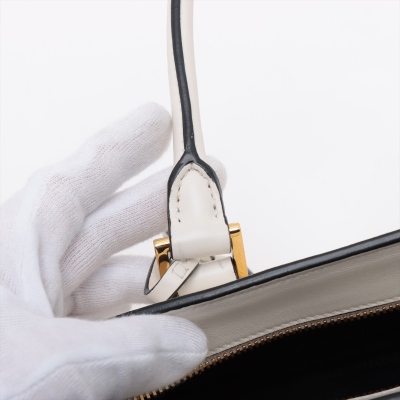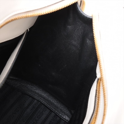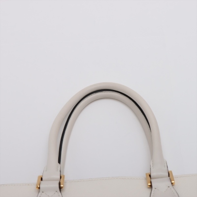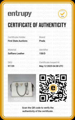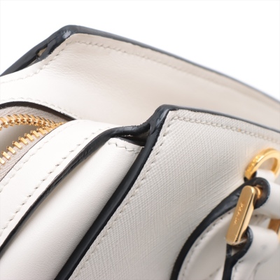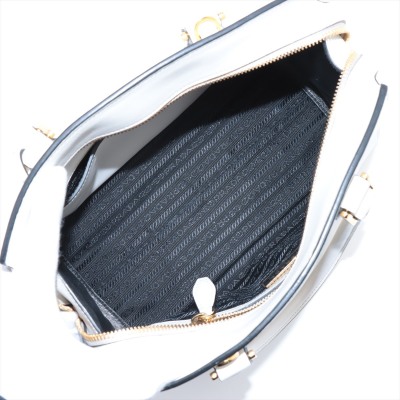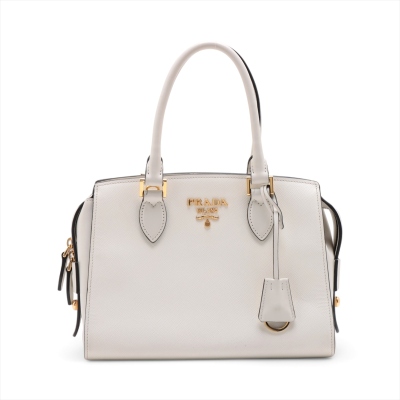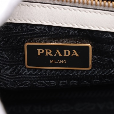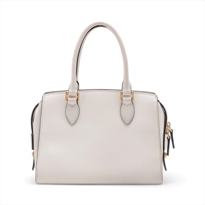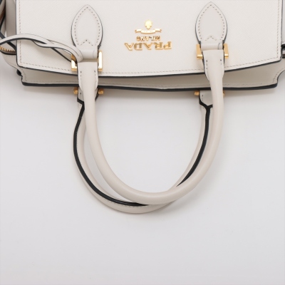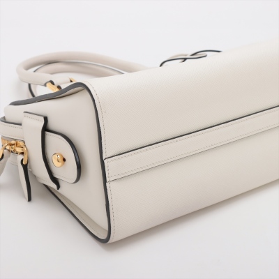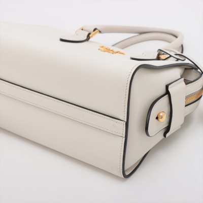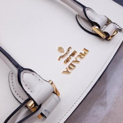 Prada Saffiano Top Handle handbag in white Saffiano leather. Featuring gold-toned hardware, dual rolled leather top handles, and detachable keyring clochette. The dual zipper closure opens to a black nylon logo-printed interior with patch and zip pockets. Approximate dimensions: 26cm(B-L) x 20cm(H) x 12cm(D), handle drop 13cm. Accompanied by Prada certification card, stamped. Note: shoulder strap NOT included. With Entrupy Certificate of Authenticity. (Pre-owned)