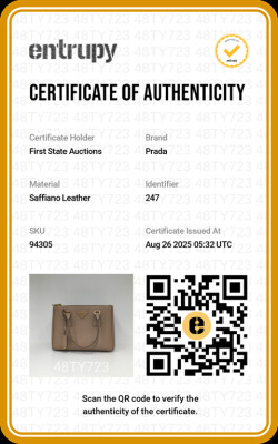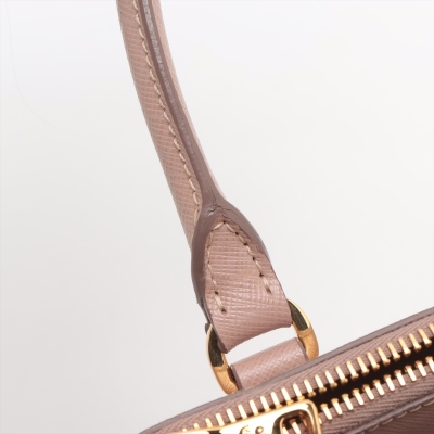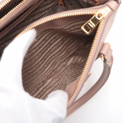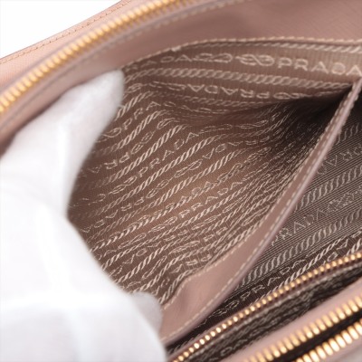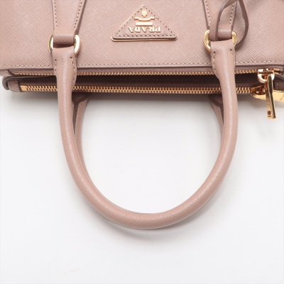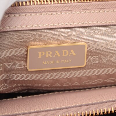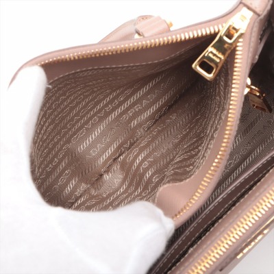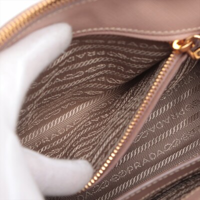 Prada small Galleria bag in beige Saffiano leather. Featuring gold-toned hardware, dual leather rolled handles, two external zip pockets, and snap closures at sides. The top opens to a beige nylon logo-lined interior with patch and zip pockets. Approximate dimensions: 25cm(Base-L) x 17cm(H) x 12cm(D), handle drop 11cm, adjustable and detachable shoulder strap drop 60cm. With Entrupy Certificate of Authenticity. (Pre-owned)
