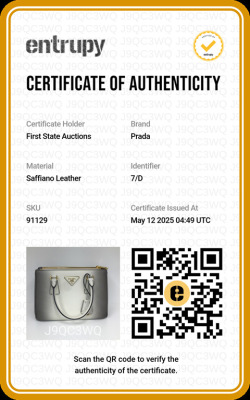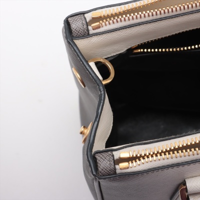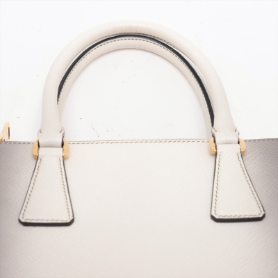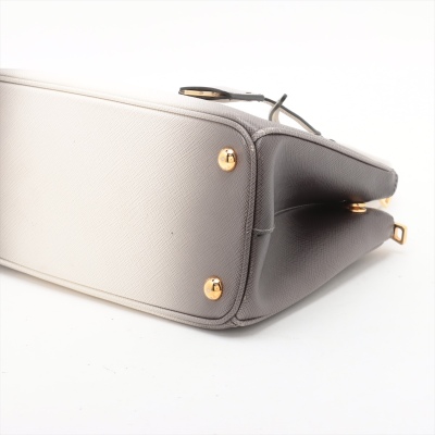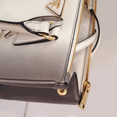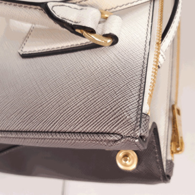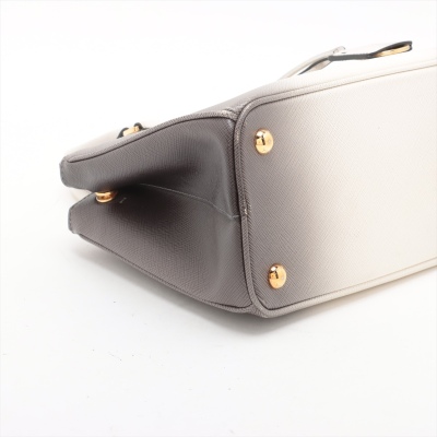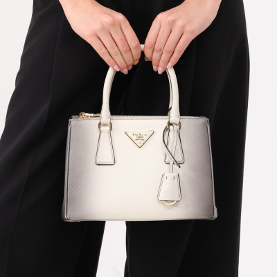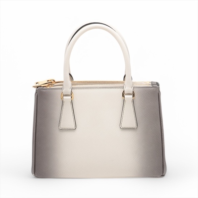 Prada small Galleria handbag in ombre grey to white Saffiano leather. Featuring gold-toned hardware, zip pockets at front & back, triangle metal logo detail, and button closures on sides. The top opens to black leather interior with zip and patch pockets. Approx. dimensions: 25cm(L) x 17cm(H) x 12cm(D), handle drop 11cm, adjustable & detachable shoulder strap drop 60cm. Accompanied by Prada dustbag. With Entrupy Certificate of Authenticity. (Pre-owned)