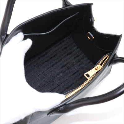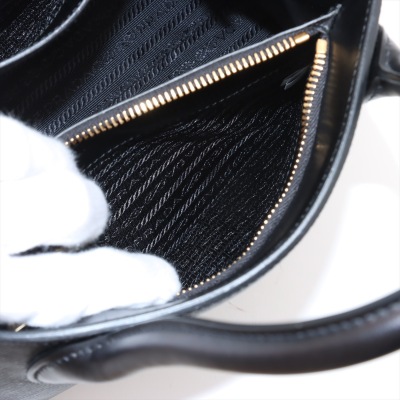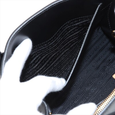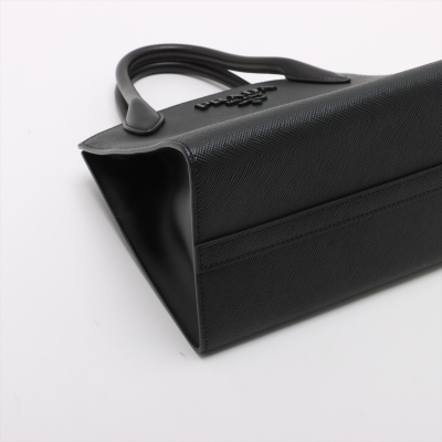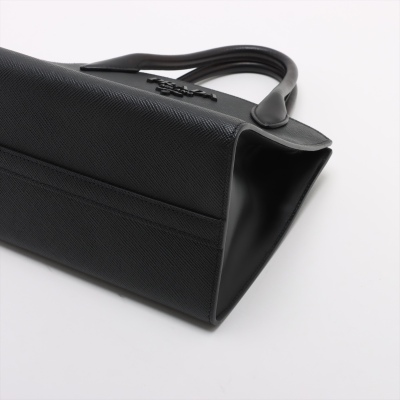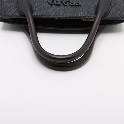 Prada small Monochrome top handle bag in black Saffiano leather. Featuring gold-toned hardware, double rolled top handles, black letter logo at front, snap buttons for expandable sides. The top opens to a black nylon interior with zip & patch pockets. Approx. dimensions: 26cm(B-L) x 21cm(H) x 13cm(D), handle drop 9cm, detachable strap drop: 56cm. Accompanied by detachable leather purse, Prada dustbag, and certificate card. With Entrupy Certificate of Authenticity. (Pre-owned)