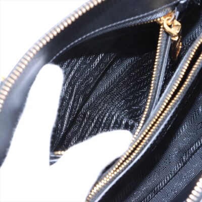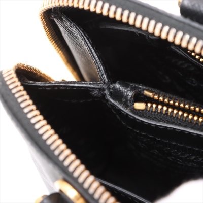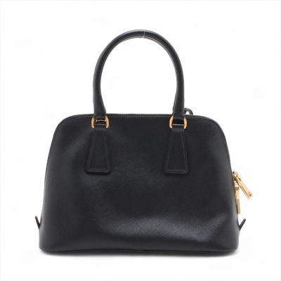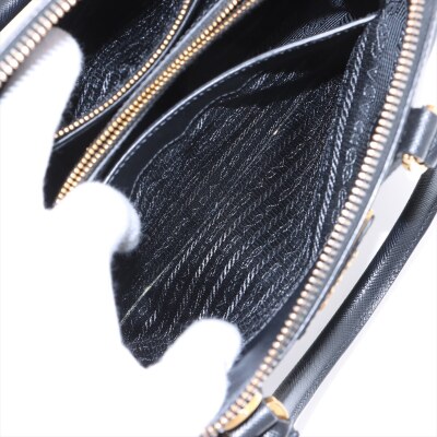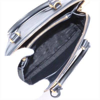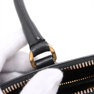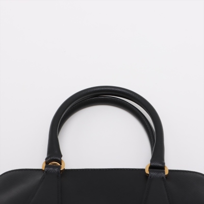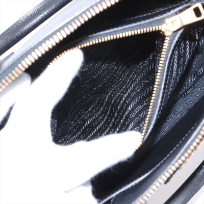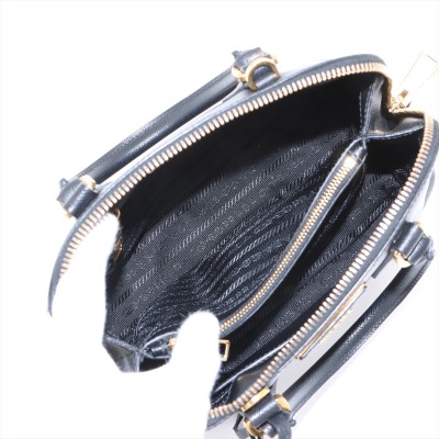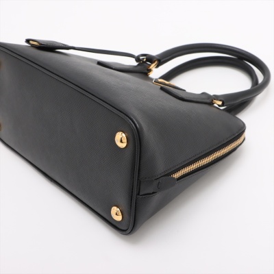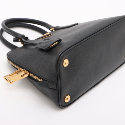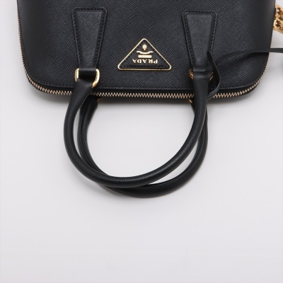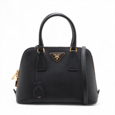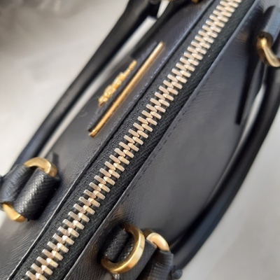 Prada small Promenade bag in black Saffiano leather. Featuring gold tone hardware, leather top handles with brass links, leather logo plate on front. The 2-way zipper closure opens to a nylon lining interior with 2 compartments divided by centre pocket. Approx dimensions: 26cm(B-L) x 17cm(H) x 11.5cm(D), 7.5cm handle drop and 63cm shoulder strap drop. Accompanied by a clochette with keyring. With Entrupy Certificate of Authenticity. (Pre-owned)