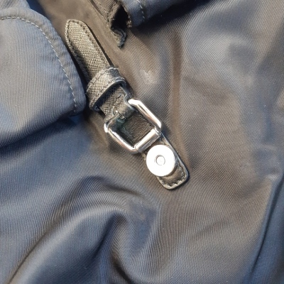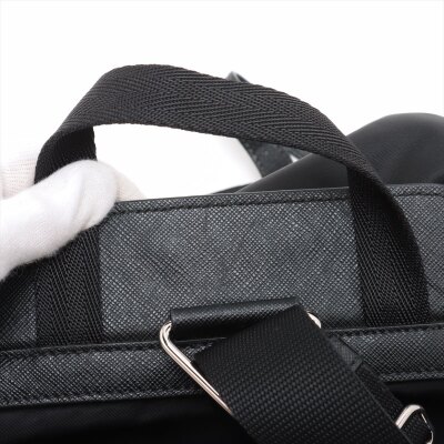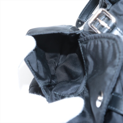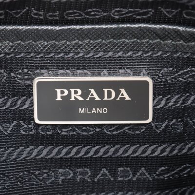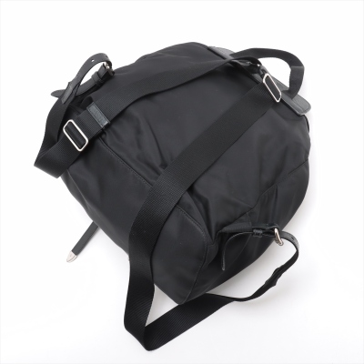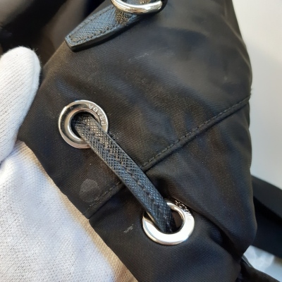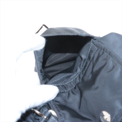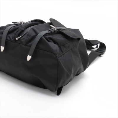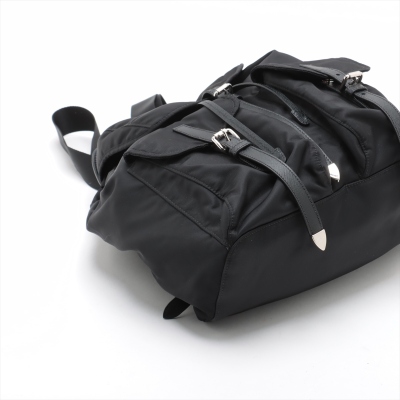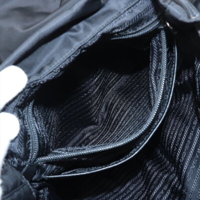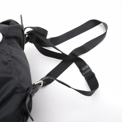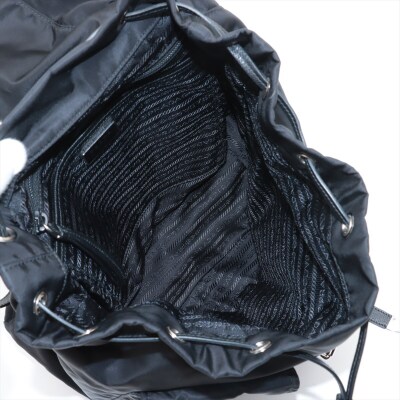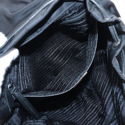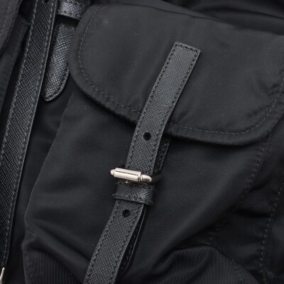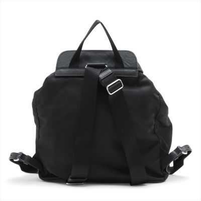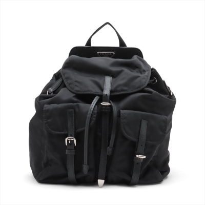 Prada small Tessuto backpack in black tessuto nylon and Saffiano leather details. Featuring silver-toned hardware, twin front exterior magnetic pockets, dual web shoulder straps. The magnetic closure, flap, and drawstring closure open to nylon logo-lined interior with zip & patch pockets. Approx dimensions: 29cm(L) x 31cm(H) x 15cm(D), handle drop 10cm, straps drop 42cm, Adjustable. Accompanied by Prada dustbag. With Entrupy Certificate of Authenticity. (Pre-owned)