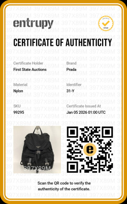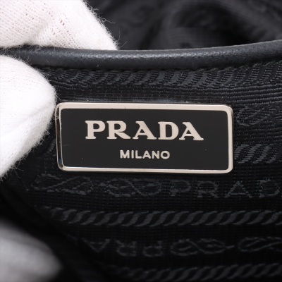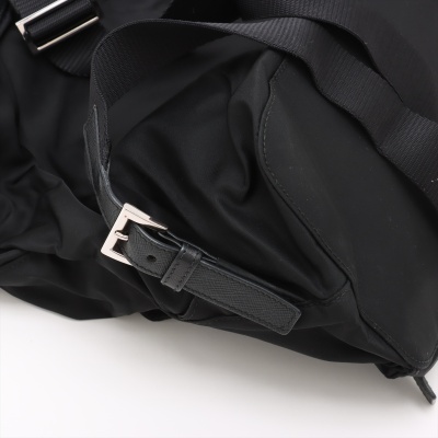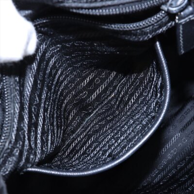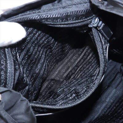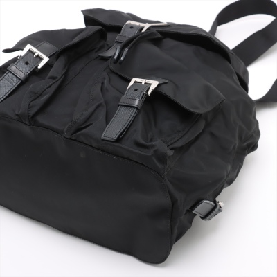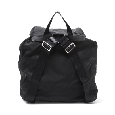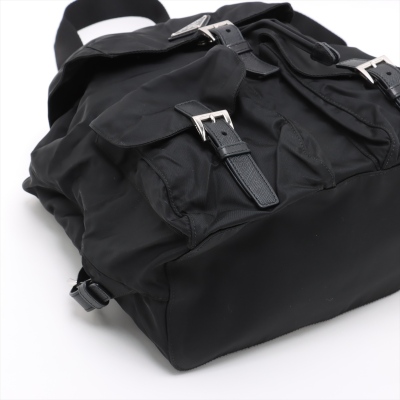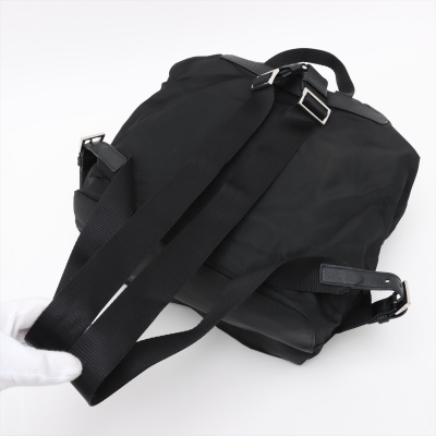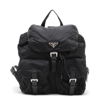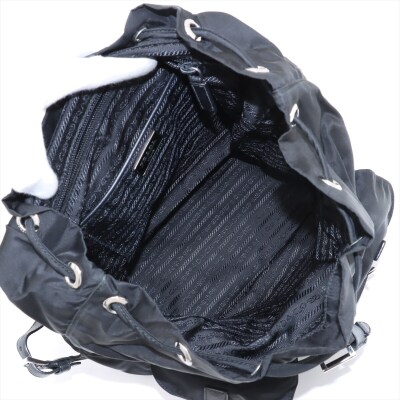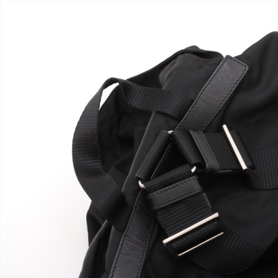 Prada small Tessuto backpack in black tessuto nylon and Saffiano leather details. Featuring silver-toned hardware, twin front exterior magnetic pockets, dual web shoulder straps. The magnetic closure, flap, and drawstring closure open to nylon logo-lined interior with a zip pocket and a patch pocket. Approximate dimensions: 29cm(L) x 25cm(H) x 15cm(D), handle drop 8.5cm, straps drop 37cm, Adjustable. Accompanied by a Prada dustbag, authenticity card (dated 24/10/2013) and care card. With Entrupy Certificate of Authenticity.
