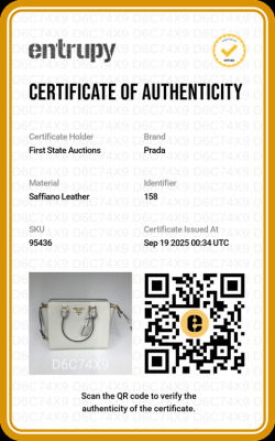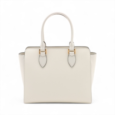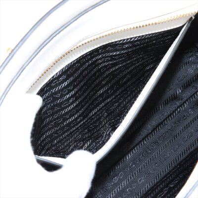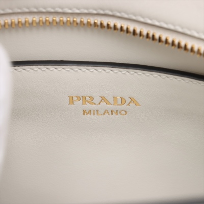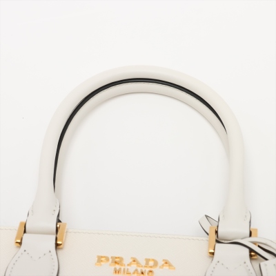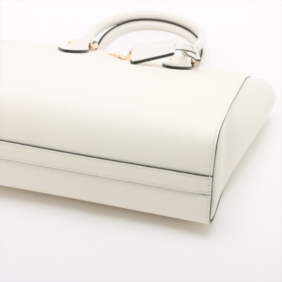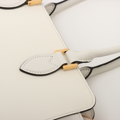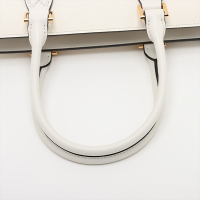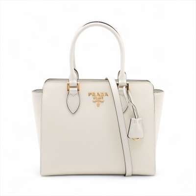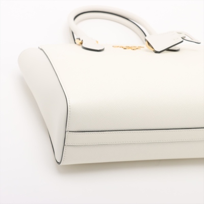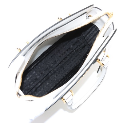 Prada tote bag in white Saffiano soft calfskin leather on sides. Featuring rolled top handles, gold tone hardware, logo details at front. The top with 2 way zipper closure opens to a logo Jacquard nylon interior with zipper and patch pockets. Approximate dimensions: 26cm(W) x 21cm(H) x 10cm(D), 13cm handle drop, 54cm shoulder drop, adjustable. Accompanied by a leather crochet & keyring, info cards & dustbag. With Entrupy Certificate of Authenticity. (Pre-owned)