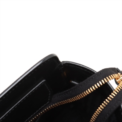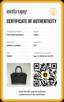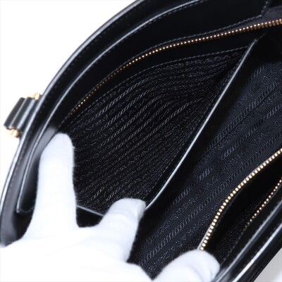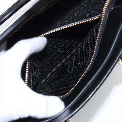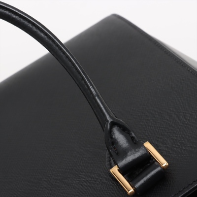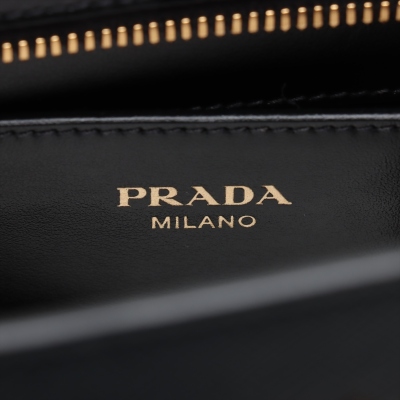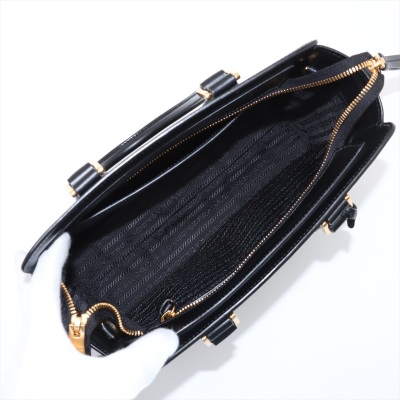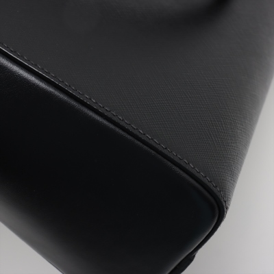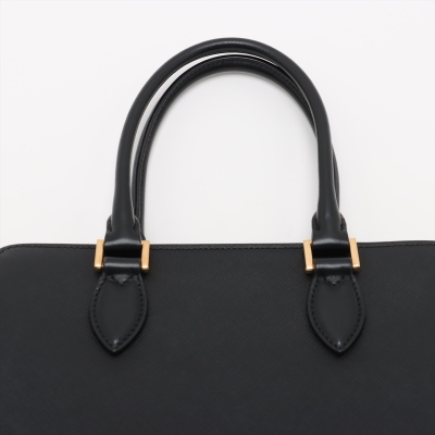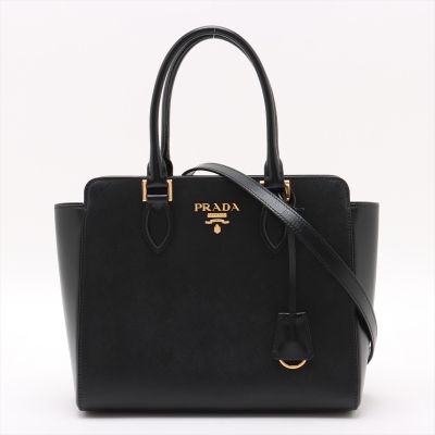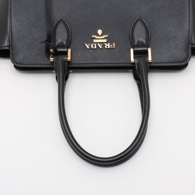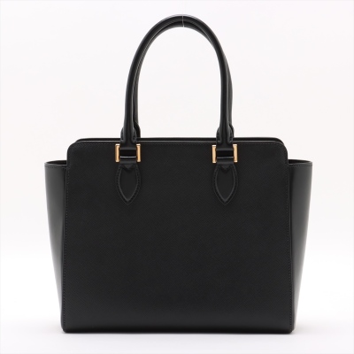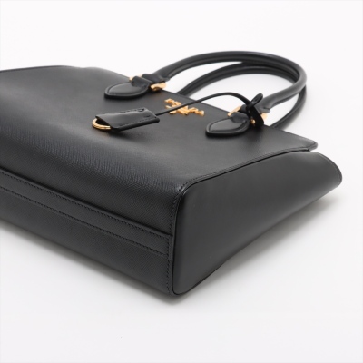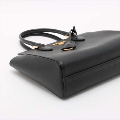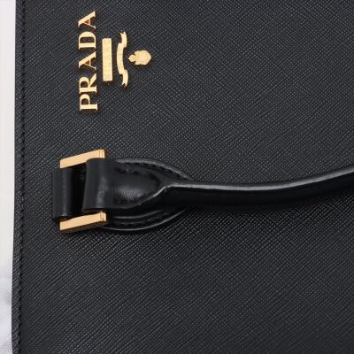 Prada tote bag in black Saffiano and soft smooth calfskin on sides. Featuring rolled top handles, gold tone hardware, logo lettering details at front. The top with 2ways zipper closure opens to a logo Jacquard nylon lining interior with zipper and patch pockets. Approximate dimensions: 26cm(B-W) x 21cm(H) x 10cm(D), 13cm handle drop, and 50cm shoulder drop, adjustable. Accompanied by a keyring leather clochette Prada card (dated 27/08/2020) and dustbag. With Entrupy Certificate of Authenticity. (Pre-owned)