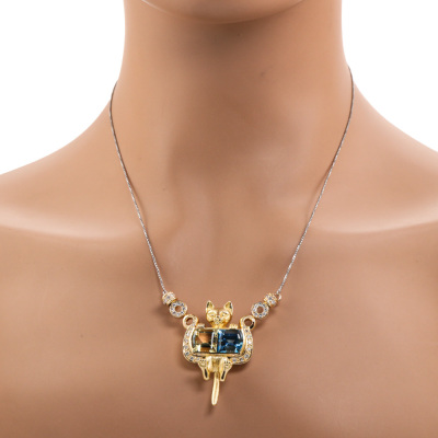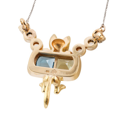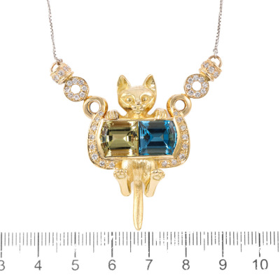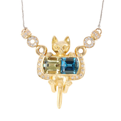 Cat design necklace with pentagon cut Natural Lemon Quartz of approximately 4.00ct, pentagon cut Natural blue Topaz of approximately 4.00ct and round Natural Diamonds totalling 0.70ct (Estimated grading: G-H SI). 18ct yellow gold with platinum 850 attached chain. Length: 41.5cm - 45cm. Weight: 27.3g. (Pre-owned)