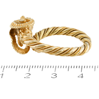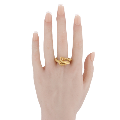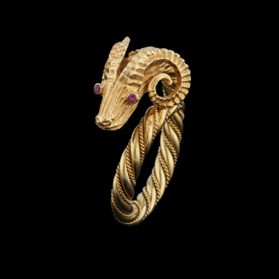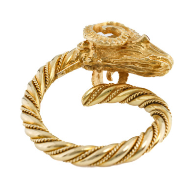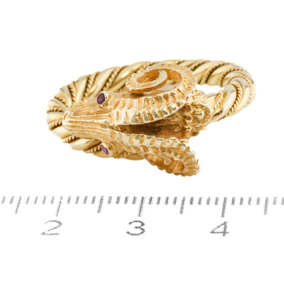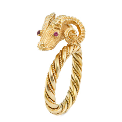 Ram head design open ring, twist band with two round Natural Pink Sapphires of approximately 0.02ct. 18ct yellow gold. Ring size: R1/2. Band Width: 3.7mm. Weight: 14.0g. (Pre-owned)