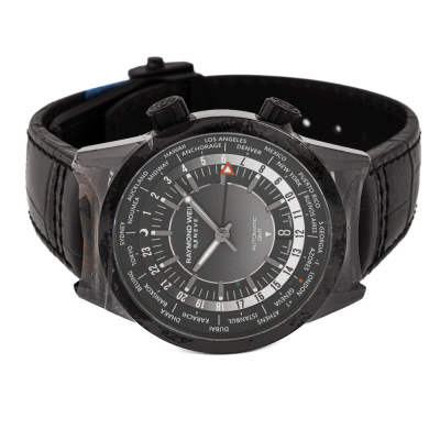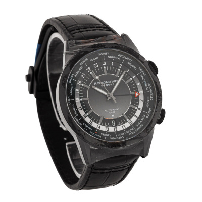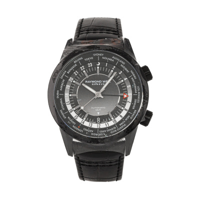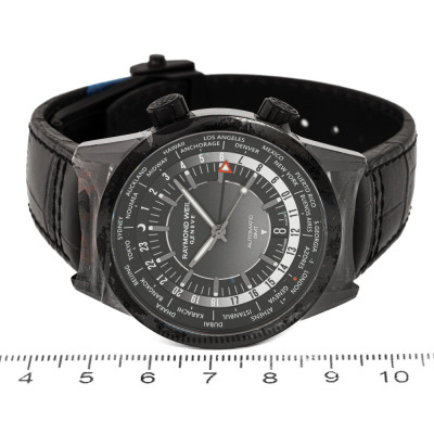 Raymond Weil Freelancer GMT Worldtimer stainless steel automatic mens watch. Black dial, date, case diameter: 41mm, maximum wrist size: 20.5cm, Swiss made. Ref# 2765-BKC-20001. With Raymond Weil black leather and clasp. With undated Raymond Weil Guarantee card and Raymond Weil box. 12 month FSA warranty. Weight: 82.8g (Note: case in original wrapping and slight wear on strap due to being a stock display)