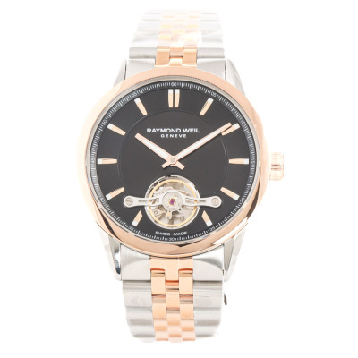 Raymond Weil Freelancer stainless steel with yellow gold PVD plating automatic mens watch. Black dial, case diameter: 42.5mm, wrist size: 20.5cm, Swiss made. Ref# 2781-SP5-20051. With Raymond Weil two-tone bracelet and clasp. With Undated Raymond Weil Guarantee card and Raymond Weil box. 12 month FSA warranty. (As new, note: case and bracelet in original wrap)