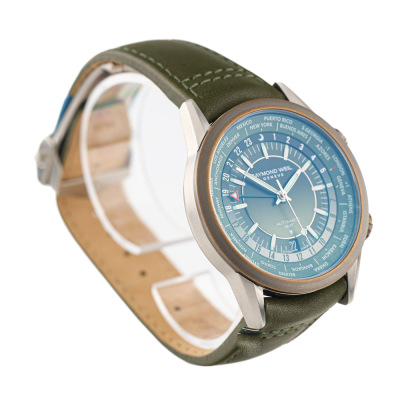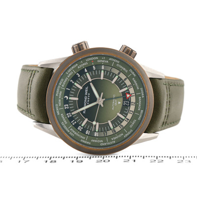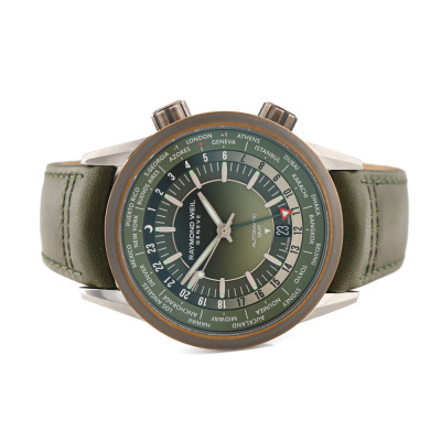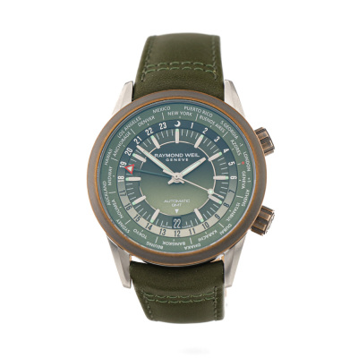 Raymond Weil Freelancer GMT stainless steel and bronze automatic mens watch. Gradient green dial,, date, case diameter: 40.5mm, strap length: 21.5cm, Swiss made. Ref# 2765-SBC-52001. With Raymond Weil green leather strap and clasp. With Raymond Weil undated guarantee card and Raymond weil box. 12 month FSA warranty (As new, note: case on original wrap and minor wear marks on strap due to being stock display)