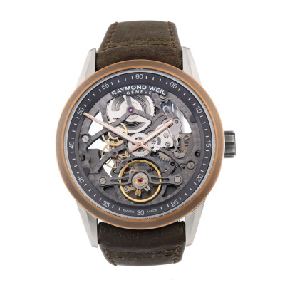Raymond Weil Freelancer stainless steel and bronze automatic mens watch. Skeleton dial, case diameter: 42mm, strap length: 21.5cm, Swiss made. Ref# 2785-SBC-60000. With Raymond Weil brown leather strap and clasp. With Raymond Weil undated Guarantee card and Raymond Weil box. 12 months FSA warranty (As new, Note: clasp is in original wrapping and slight wear on the strap due to being a stock display)