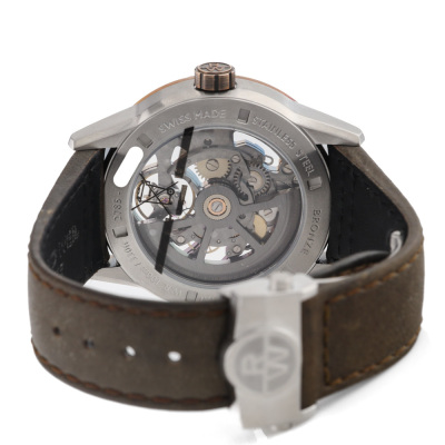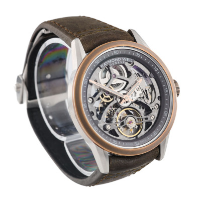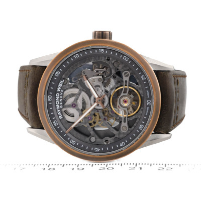 Raymond Weil Freelancer stainless steel and bronze automatic mens watch. Skeleton dial, case diameter: 42mm, strap length: 21.5cm, Swiss made. Ref# 2785-SBC-60000. With Raymond Weil brown leather strap and clasp. With Raymond Weil undated Guarantee card and Raymond Weil box. 12 months FSA warranty (As new, Note: clasp is in original wrapping and slight wear on the strap due to being a stock display)
