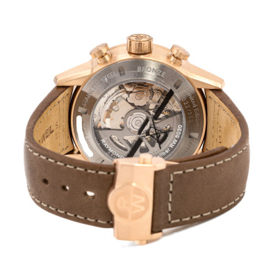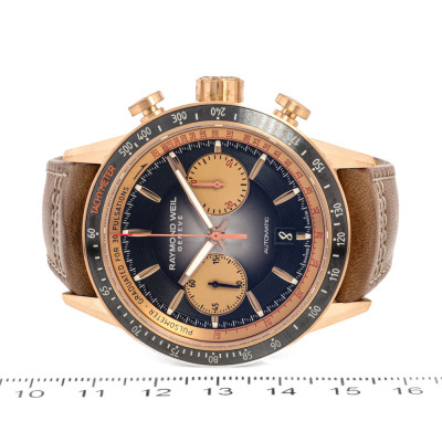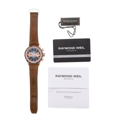 Raymond Weil Freelancer Limited Edition of 300 bronze & stainless steel automatic mens watch. Gradient black chronograph dial, case diameter: 43.5mm, adjustable max wrist size: 22cm, Swiss made. Ref# 7780-B1-20422. With Raymond Weil brown leather strap & clasp. With undated Raymond Weil Guarantee card, Certificate of Authenticity & Raymond Weil box. 12 month warranty (As new. Note: case in original wrapping and wear on strap due to being a stock display).
