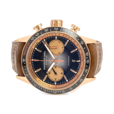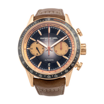 Raymond Weil Freelancer Limited Edition of 300 bronze & stainless steel automatic mens watch. Gradient black chronograph dial, case diameter: 43.5mm, adjustable max wrist size: 22cm, Swiss made. Ref# 7780-B1-20422. With Raymond Weil brown leather strap & clasp. With undated Raymond Weil Guarantee card, Certificate of Authenticity & Raymond Weil box. 12 month warranty (As new. Note: case in original wrapping and light wear on strap due to being a stock display).