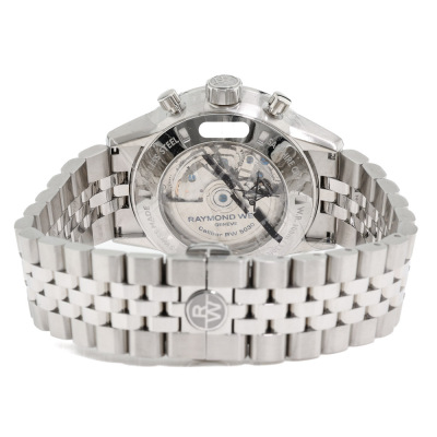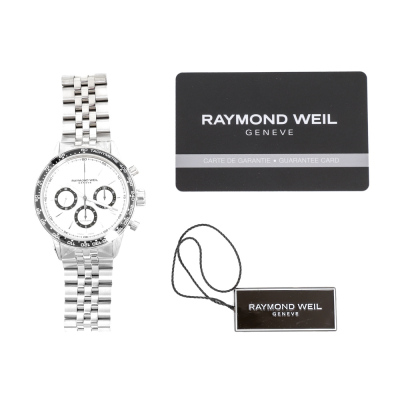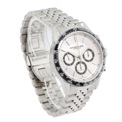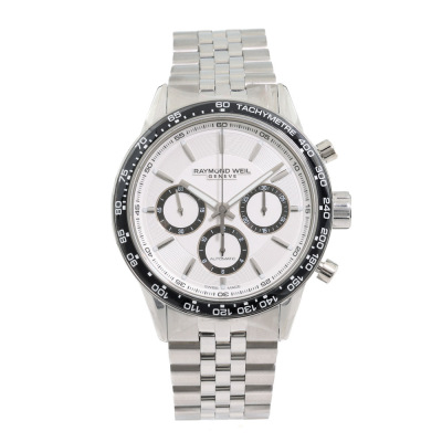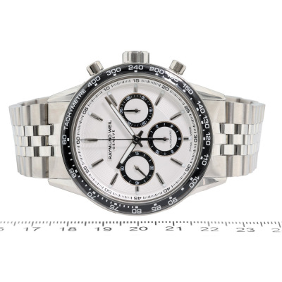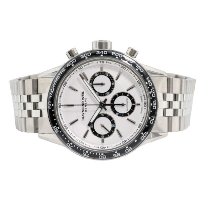 Raymond Weil Freelancer stainless steel automatic mens watch. Silver chronograph dial, case diameter: 43.5mm, wrist size: 21cm, Swiss made. Ref# 7741-ST1-30021. With Raymond Weil stainless steel bracelet and clasp. With undated Raymond Weil Guarantee card and Raymond Weil box. 12 month FSA warranty. Weight: 213.1g (As new, Note: case in original wrapping and minor scratches on the bracelet due to being a stock display).