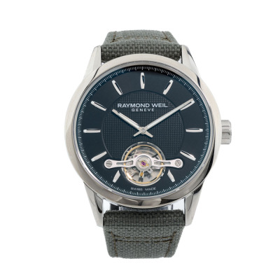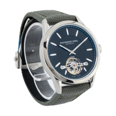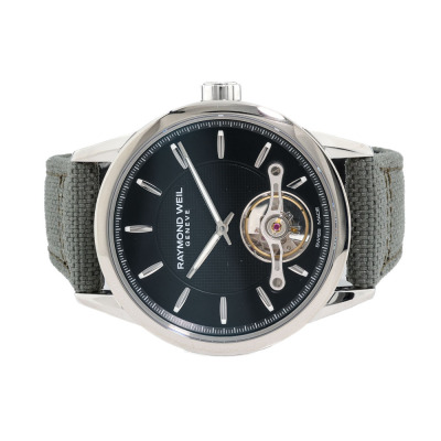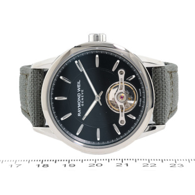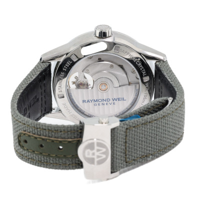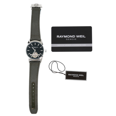 Raymond Weil Freelancer stainless steel automatic mens watch. Black dial, case diameter: 42mm, adjustable max wrist size: 21.5cm, Swiss made. Ref# 2780-STC-20001. With Raymond Weil Green textile over leather strap and clasp. With undated Raymond Weil Guarantee card and Raymond Weil box. 12 month FSA warranty (As new, Note: minor scratches on case and light wear marks on the strap due to being a stock display).