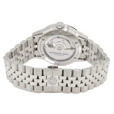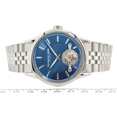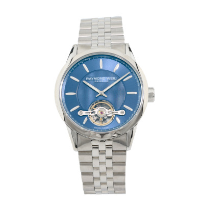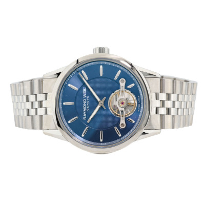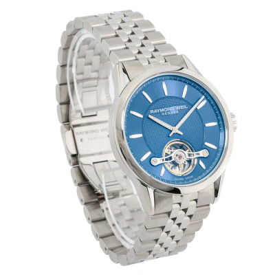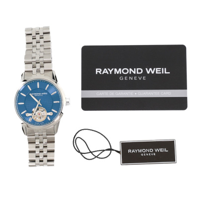 Raymond Weil Freelancer stainless steel automatic mens watch. Blue dial, case diameter: 42.5mm, wrist size: 19.5cm, Swiss made. Ref #2780-ST-50001. With Raymond Weil stainless steel bracelet and clasp. With undated Raymond Weil Guarantee card and Raymond Weil box. 12 month FSA warranty (AS new, Note: minor scratches on case and bracelet due to being a stock display)