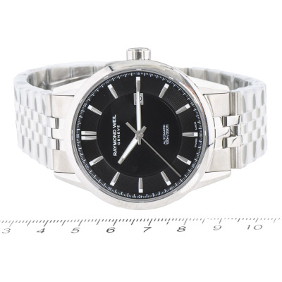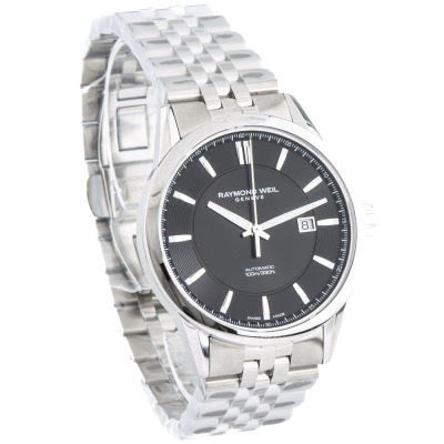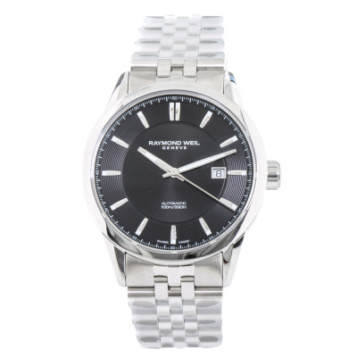 Raymond Weil Freelancer stainless steel automatic mens watch. Black dial, date, case diameter: 42mm, wrist size: 21cm, Swiss made. Ref# 2731-ST-20001. With Raymond Weil stainless steel bracelet and clasp. With Raymond Weil box. 12 month FSA warranty. Weight: 187.6g (As new, Note: case and bracelet in original wrapping)