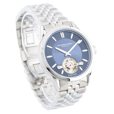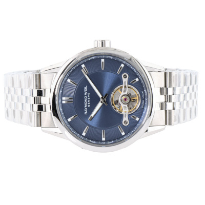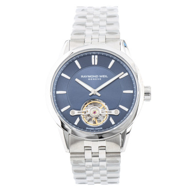 Raymond Weil Freelancer stainless steel automatic mens watch. Blue dial, case diameter: 42.5mm, wrist size: 21cm, Swiss made. Ref# 2781-ST-50051. With Raymond Weil stainless steel bracelet and clasp. With Raymond Weil box. 12 month FSA warranty. Weight: 187.5g (As new, Note: case and bracelet in original wrapping)