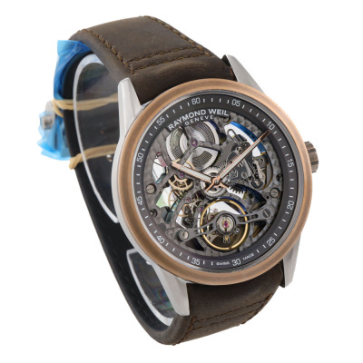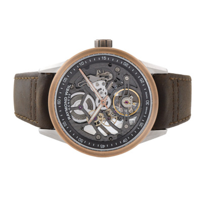 Raymond Weil Freelancer stainless steel and bronze automatic mens watch. Skeleton dial, case diameter: 42mm, adjustable max wrist size: 19cm, Swiss made. Ref# 2785-SBC-60000. With Raymond Weil brown leather strap and clasp. With Raymond Weil undated Guarantee card and Raymond Weil box. 12 months FSA warranty. Weight: 91.6g (Note: clasp in original wrapping and slight wear on the strap due to being a stock display)