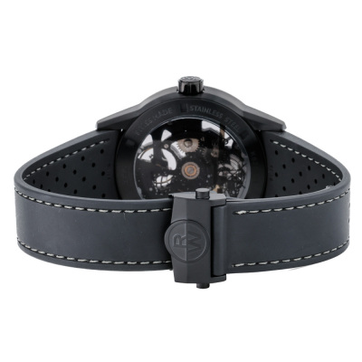 Raymond Weil Freelancer stainless steel with black PVD coating automatic mens watch. Black skeleton dial, case diameter: 42mm, adjustable max wrist size: 20.5cm, Swiss made. Ref# 2785-BKR-20000. With Raymond Weil black rubber strap and clasp. With undated Raymond Weil Guarantee card and Raymond Weil box. 12 month FSA warranty. Weight: 106.0g. (Note: case & clasp in original wrapping and light wear on strap due to being a display stock).