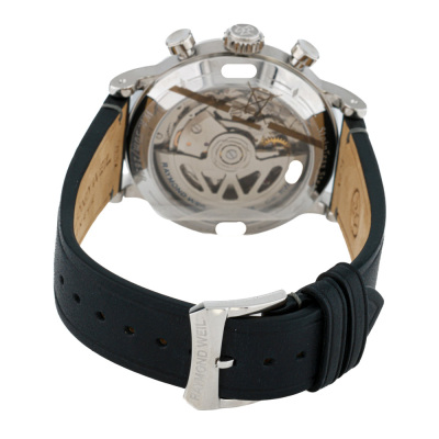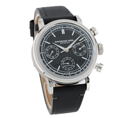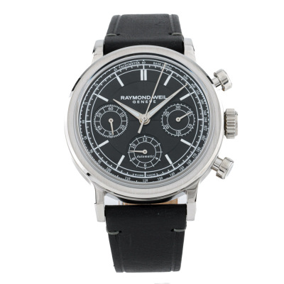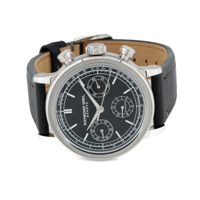 Raymond Weil Millesime stainless steel automatic mens watch. Black chronograph dial, case diameter: 39mm, max wrist size: 19.5cm, Swiss made. Ref# 7765-STC-20001. With Raymond Weil black leather strap and buckle. With undated Raymond Weil Guarantee card and Raymond Weil box. 12 month FSA warranty. Weight: 76.9g. (As new, Note: slight sign of wear due to being stock display)
