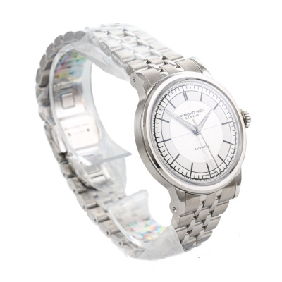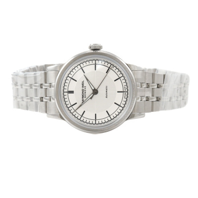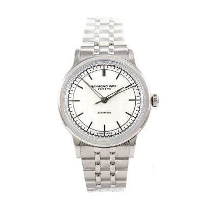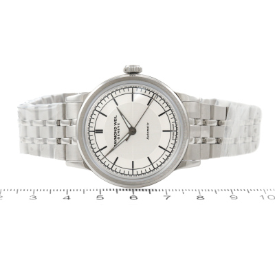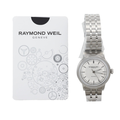 Raymond Weil Millesime stainless steel automatic watch. Silver dial, case diameter: 35mm, wrist size: 18.5cm, Swiss made. Ref# 2125-ST-65001. With Raymond Weil stainless steel bracelet and clasp. With Raymond Weil undated Guarantee card and Raymond Weil box. 12 month FSA warranty. Weight: 103.4g (As new. Note: bracelet is in original wrapping and minor scratches on the case due to being display stock)