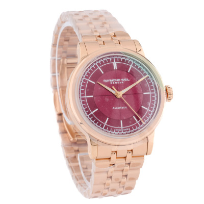 Raymond Weil Millesime stainless steel with rose gold PVD coating automatic watch. Burgundy dial, case diameter: 35mm, wrist size: 19cm, Swiss made. Ref# 2125-P5-45001. With Raymond Weil rose gold PVD coating bracelet and clasp. With undated Raymond Weil Guarantee card and Raymond Weil box. 12 month FSA warranty. Weight: 103.1g. (Note: case and bracelet in original wrapping)