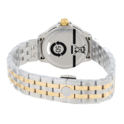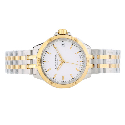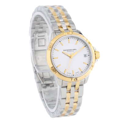 Raymond Weil Tango stainless steel & yellow gold PVD quartz ladies watch. White dial, case diameter: 30mm, wrist size: 18.5cm, Swiss made. Ref# 5960-STP-30011. With Raymond Weil two tone bracelet. With undated Raymond Weil Guarantee Card and Raymond Weil box. 12 month FSA warranty. Weight: 80.0g. (Note: case and bracelet in original wrapping).