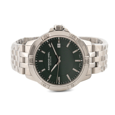 Raymond Weil Tango stainless steel quartz mens watch. Green dial, date, case diameter: 41mm, wrist size: 21cm, Swiss made. Ref# 8160-ST-52041. With Raymond Weil stainless steel bracelet and clasp. With Raymond Weil undated Guarantee card and Raymond Weil box. 12 months FSA warranty (As new, Note: back case with protective sticker and bracelet still in original wrapping)