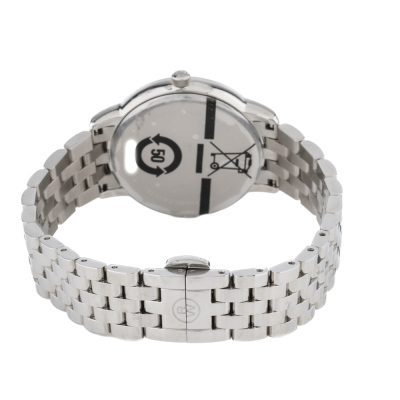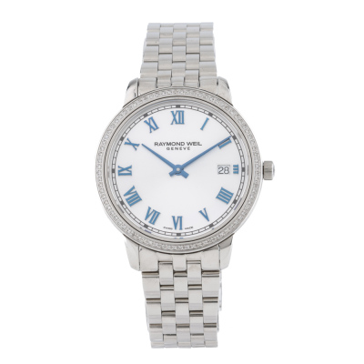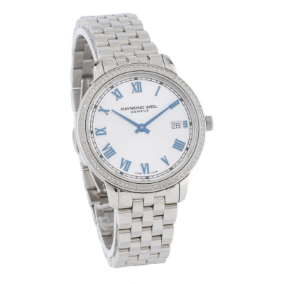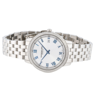 Raymond Weil Toccata Classic stainless steel quartz watch. Silver dial, Diamond set bezel, date, case diameter: 34cm, wrist size: 19cm, Swiss made. Ref# 5385-STS-00653. With Raymond Weil stainless steel bracelet and clasp. With undated Raymond Weil Guarantee card and Raymond Weil box. 12 month FSA warranty. Weight: 83.3g. (As new, Note: minor sign of wear on case and bracelet due to being stock display)