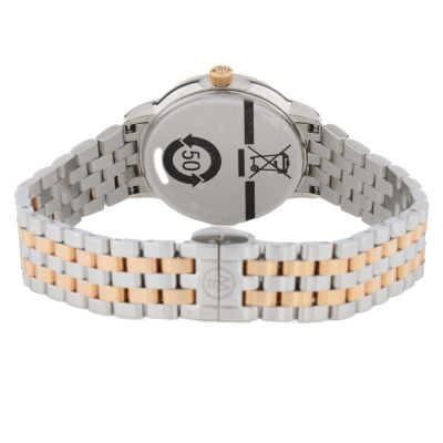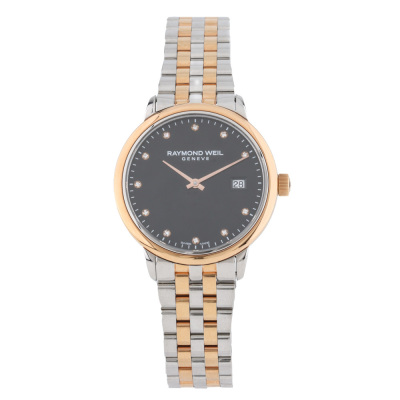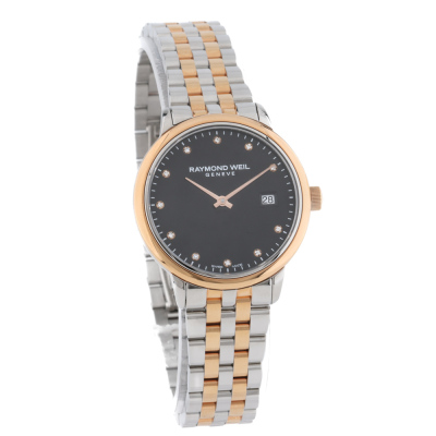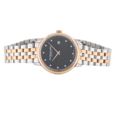 Raymond Weil Toccata stainless steel with rose gold PVD quartz ladies watch. Black dial, Diamond Indicators, case diameter: 29mm, wrist size: 18.5cm, Swiss made. Ref# 5985-SP5-20081. With Raymond Weil two-one bracelet and clasp. With undated Raymond Weil Guarantee card and Raymond Weil box. 12 month FSA warranty. Weight: 56.8g. (As new, Note: minor sign of wear on case and bracelet due to being stock display)