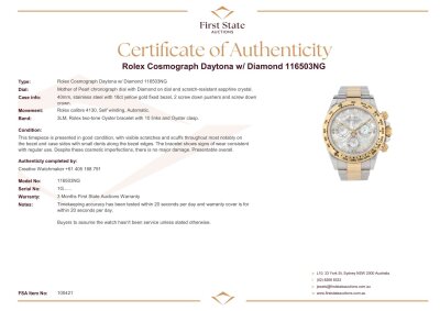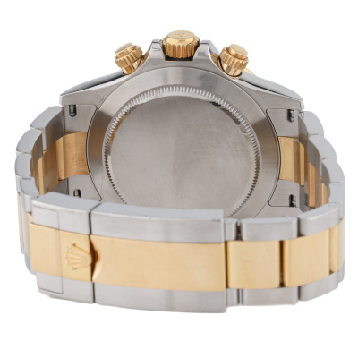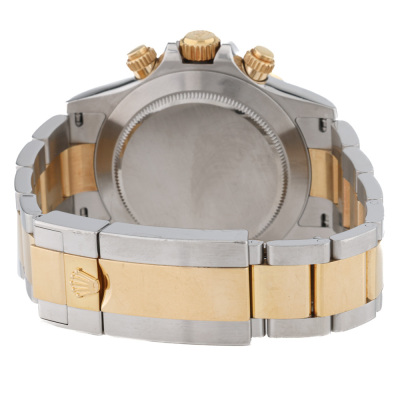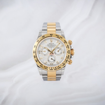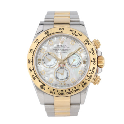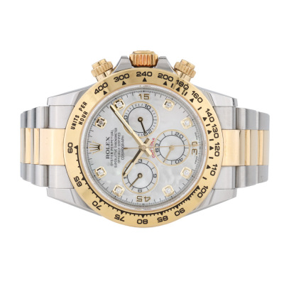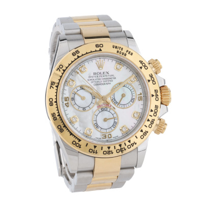 Rolex Oyster Perpetual Cosmograph Daytona 18ct yellow gold and stainless steel automatic mens watch. Mother of Pearl dial, Diamond indicators, case diameter: 40mm, wrist size: 17cm, Swiss made. Ref# 116503NG, Circa: 2011-2026. With Rolex two tone Oyster bracelet and clasp. With Certificate of Authenticity and Rolex box. 3 month FSA warranty. Weight: 153.1g