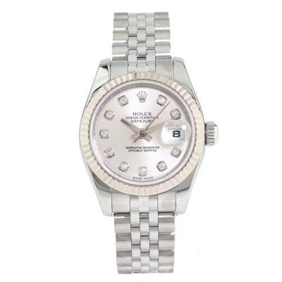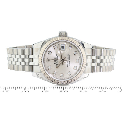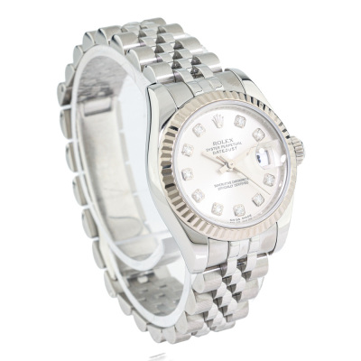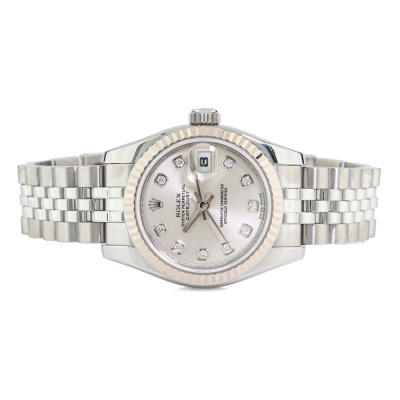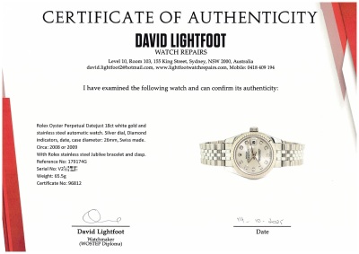 Rolex Oyster Perpetual Datejust 18ct white gold and stainless steel automatic ladies watch. Silver dial, Diamond indicators, date, case diameter: 26mm, wrist size: 15.5cm, Swiss made. Ref# 179174G. Circa: 2008 or 2009. With Rolex stainless steel Jubilee bracelet and clasp. With Certificate of Authenticity and Rolex box. 3 month FSA warranty. 65.5g (Pre-owned)