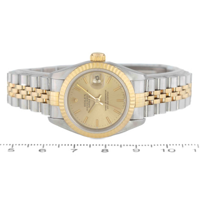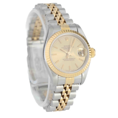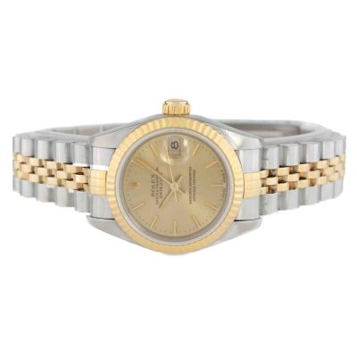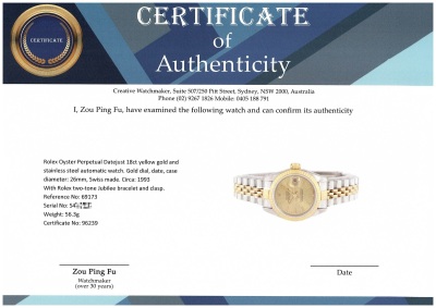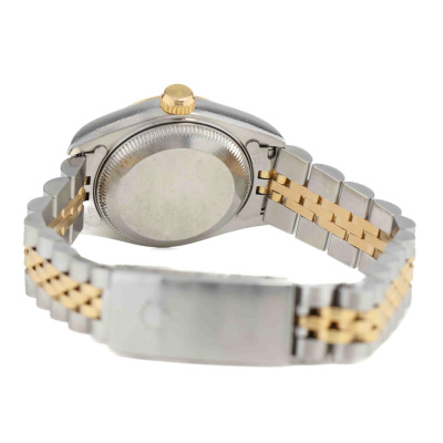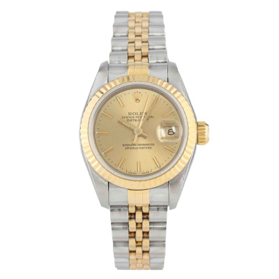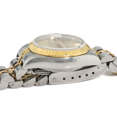 Rolex Oyster Perpetual Datejust 18ct yellow gold and stainless steel automatic ladies watch. Gold dial, date, case diameter: 26mm, wrist size: 16.5cm, Swiss made. Ref# 69173. Circa: 1993. With Rolex two-tone Jubilee bracelet and clasp. With Certificate of Authenticity and Rolex box. 6 month Creative Watchmaker warranty from the date of full service. Weight: 56.3g (Pre-owned)