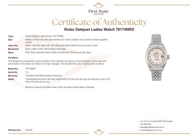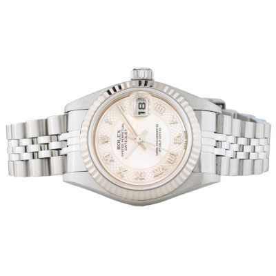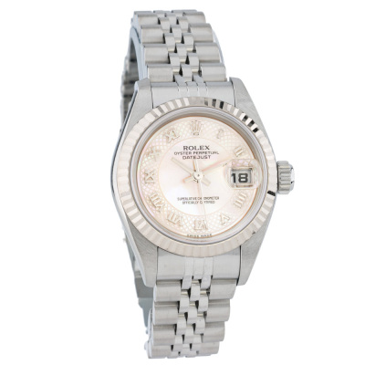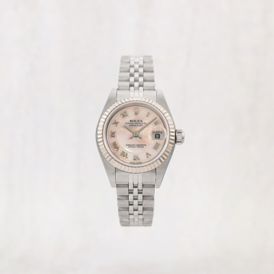 Rolex Oyster Perpetual Datejust stainless steel and 18ct white gold automatic ladies watch. Mother of Pearl dial, date, case diameter: 26mm, wrist size: 16cm, Swiss made. Ref# 79174NRD, Circa: 2002. With Rolex stainless steel Jubilee bracelet and clasp. With Certificate of Authenticity and Rolex box. 3 month FSA warranty.