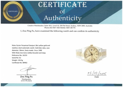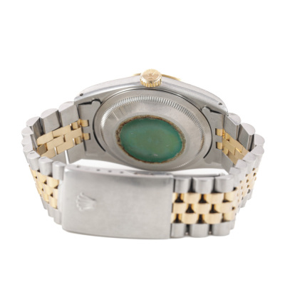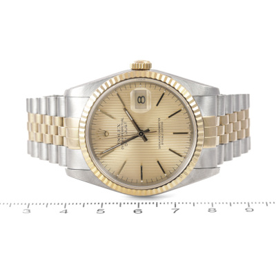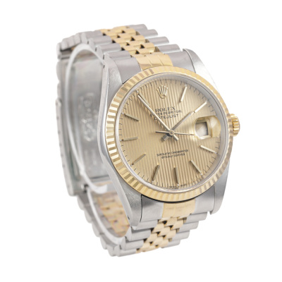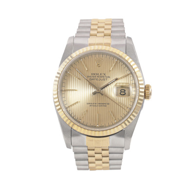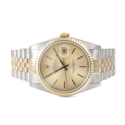 Rolex Oyster Perpetual Datejust 18ct yellow gold and stainless steel automatic mens watch. Gold dial, date, case diameter: 36mm, wrist size: 17cm, Swiss made. Ref# 16233, Circa: 1990. With Rolex two-tone Jubilee bracelet and clasp. With Certificate of Authenticity and Creative full service invoice dated 03/04/25. 6 month Creative Watchmaker warranty from the date of full service. (Pre-owned)
