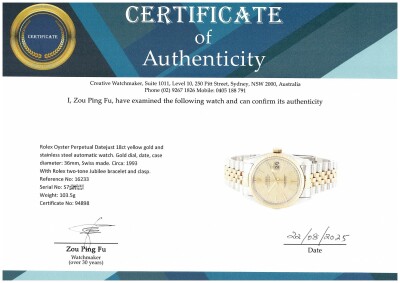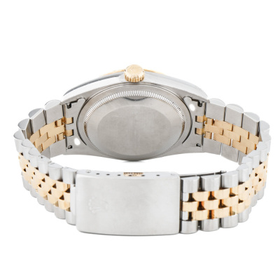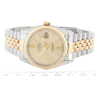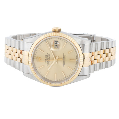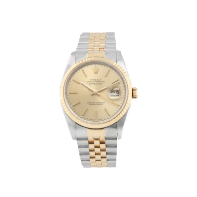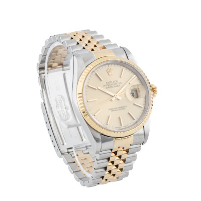 Rolex Oyster Perpetual Datejust 18ct yellow gold and stainless steel automatic mens watch. Gold dial, date, case diameter: 36mm, max wrist size: 19cm, Swiss made. Ref# 16233. Circa: 1993. With Rolex two-tone Jubilee bracelet and clasp. With Certificate of Authenticity and Rolex box. 3 month FSA warranty. Weight: 103.5g (Pre-owned)