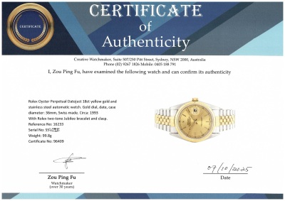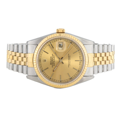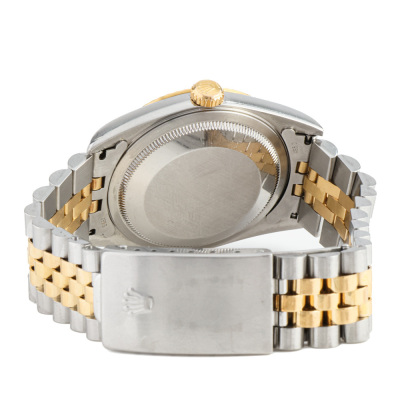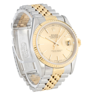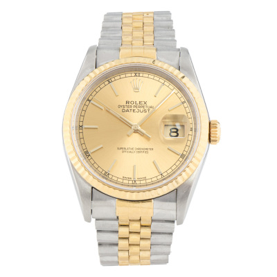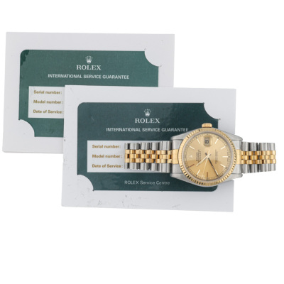 Rolex Oyster Perpetual Datejust 18ct yellow gold and stainless steel automatic mens watch. Gold dial, date, case diameter: 36mm, wrist size: 18.5cm, Swiss made. Ref# 16233. Circa: 1993. With Rolex two-tone Jubilee bracelet and clasp. With Certificate of Authenticity, Rolex International Service Guarantee card dated 26/11/26 & 29/08/2023 and Rolex box. 3 month FSA warranty. Weight: 99.8g (Pre-owned)