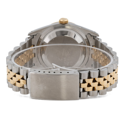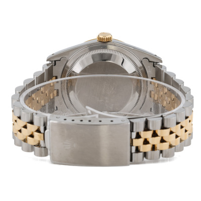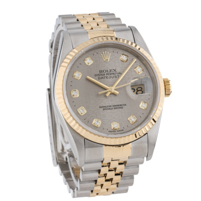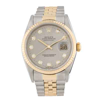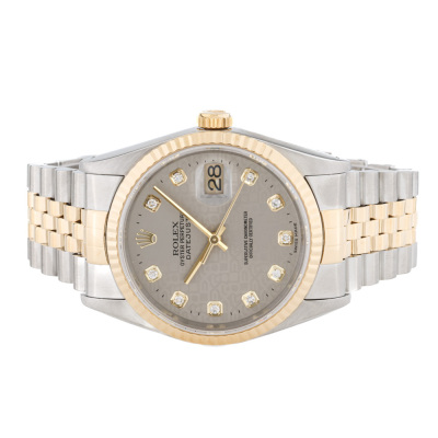 Rolex Oyster Perpetual Datejust stainless steel and yellow gold automatic mens watch. Grey monogram dial, Diamond indicators, date, case diameter: 36mm, wrist size: 17cm, Swiss made. Ref# 16233G. Circa: 1993. With Rolex two-tone Jubilee bracelet and clasp. With Certificate of Authenticity and Rolex box. 3 month FSA warranty. Weight: 97.1g.
