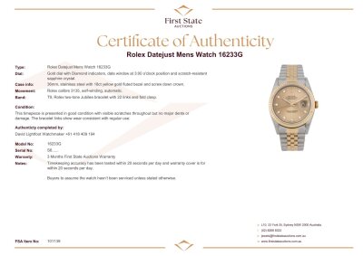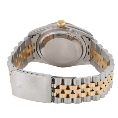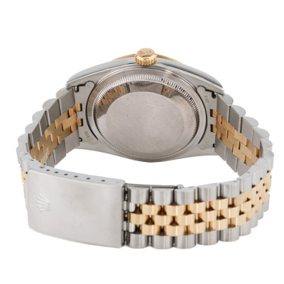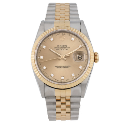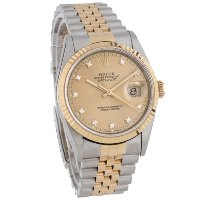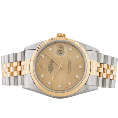 Rolex Oyster Perpetual Datejust stainless steel and yellow gold automatic mens watch. Gold dial, Diamond indicators, date, case diameter: 36mm, wrist size: 19cm, Swiss made. Ref# 16233G. Circa: 1993. With Rolex two-tone Jubilee bracelet and clasp. With Certificate of Authenticity, undated Rolex Warranty Certificate and Rolex box. 3 month FSA warranty. Weight: 105.3g.