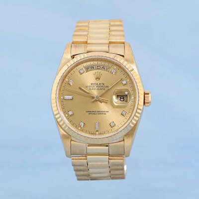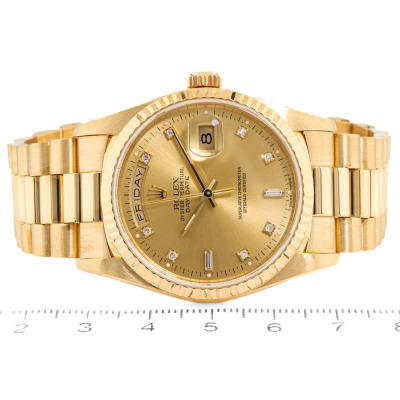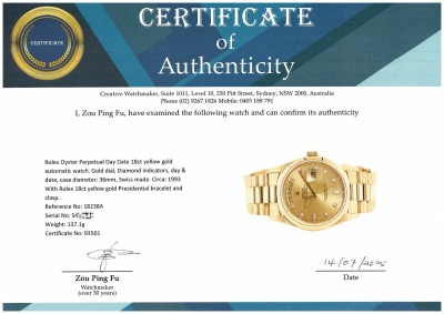 Rolex Oyster Perpetual Day Date 18ct yellow gold automatic mens watch. Gold dial, Diamond indicators, day & date, case diameter: 36mm, wrist size: 17.5cm, Swiss made. Ref# 18238A. Circa: 1993. With Rolex 18ct yellow gold Presidential bracelet and clasp. With Certificate of Authenticity, Rolex International Service Guarantee card dated 03/12/2015 and Rolex pouch. 3 month FSA warranty. (Pre-owned)