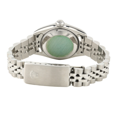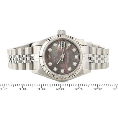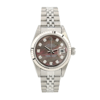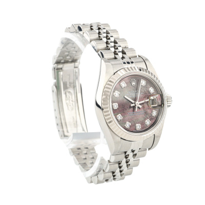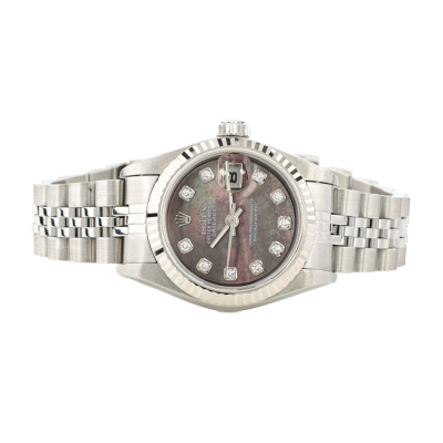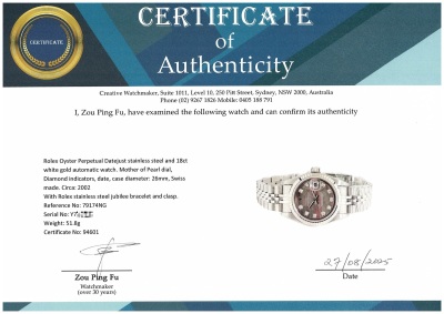 Rolex Oyster Perpetual Datejust stainless steel and 18ct white gold automatic ladies watch. Mother of Pearl dial, Diamond indicators, date, case diameter: 26mm, wrist size: 15.5cm, Swiss made. Ref# 79174NG, Circa: 2002. With Rolex stainless steel jubilee bracelet and clasp. With Certificate of Authenticity and Rolex box. 3 month FSA warranty. (Pre-owned)