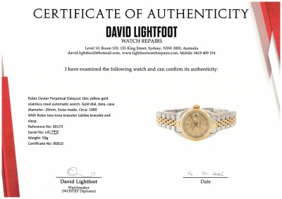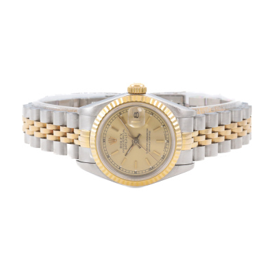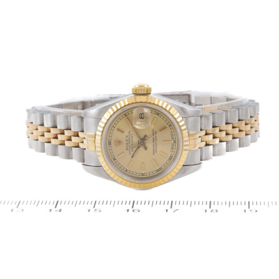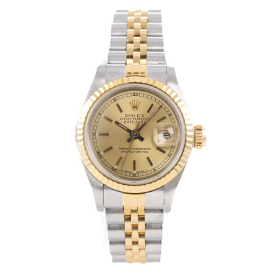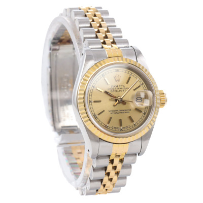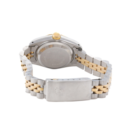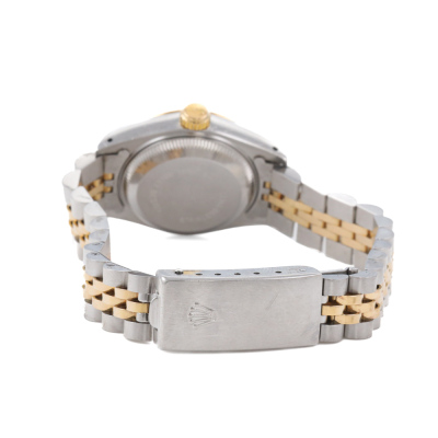 Rolex Oyster Perpetual Datejust 18ct yellow gold stainless steel automatic ladies watch. Gold dial, date, case diameter: 26mm, wrist size: 17.5cm, Swiss made. Ref# 69173. Circa: 1989. With Rolex two-tone bracelet Jubilee bracelet and clasp. With Certificate of Authenticity, undated Rolex Guarantee Certificate and Rolex box. 3 month FSA warranty. Weight: 58g (Pre-owned)