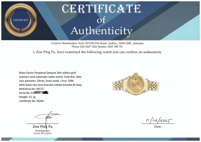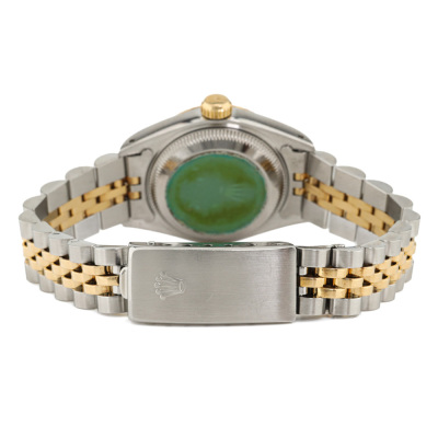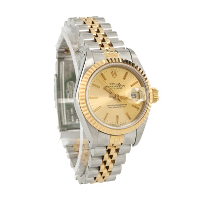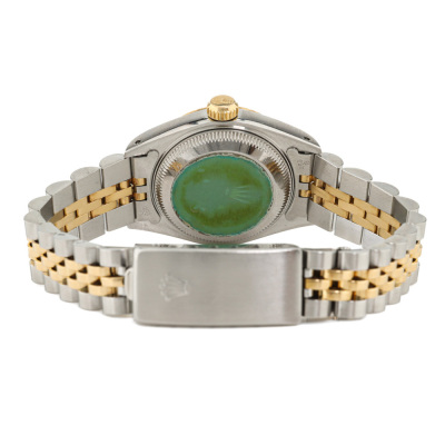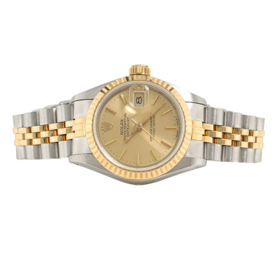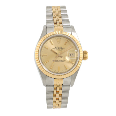 Rolex Oyster Perpetual Datejust 18ct yellow gold stainless steel automatic ladies watch. Gold dial, date, case diameter: 26mm, wrist size: 16cm, Swiss made. Ref# 69173. Circa: 1990. With Rolex two-tone bracelet Jubilee bracelet and clasp. With Certificate of Authenticity and Rolex box. 3 month FSA warranty. Weight: 55.1g (Pre-owned)